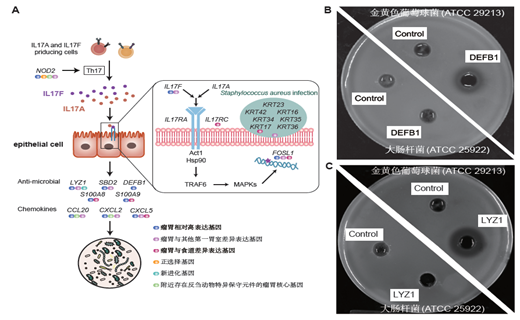 瘤胃调控微生物。A.瘤胃关键基因在IL17信号通路和金黄色葡萄球菌感染通路中涉及的多种遗传机制,B.瘤胃新基因DEFB1和C. 新基因LYZ1对金黄色葡萄球菌有抑菌活性。