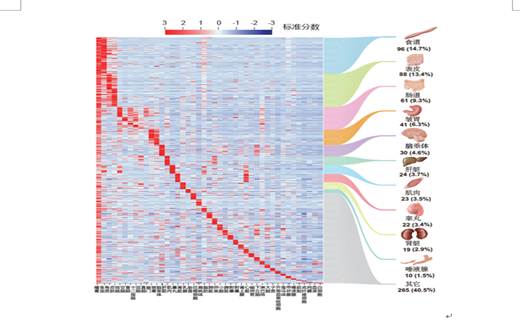 该研究利用首次开发的组织特异表达基因筛选指标E50,鉴定到655个瘤胃相对其他组织高表达的基因。其中14.7%的基因来自食道组织,其余的大部分募集自表皮、免疫和消化代谢等相关组织,这些基因参与的功能通路都与瘤胃已知的功能高度相关。通过比较骆驼、鲸豚和反刍动物的第一胃室的表达谱,研究结果发现瘤胃与鲸偶蹄目其他物种的第一胃室可能共享来自食道的发育起源,瘤胃不仅上调了食道表达的基因,还从其他组织募集了更多基因的表达,从而进化出不同的表皮结构、增强的酮体代谢和特异调控微生物群落结构的能力。