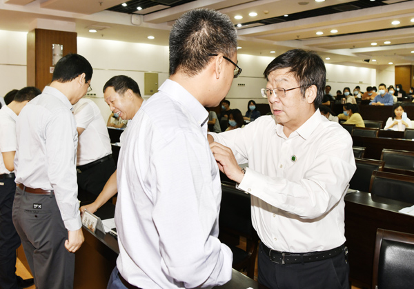 吴普特等校领导为学校2021年新教工代表佩戴校徽